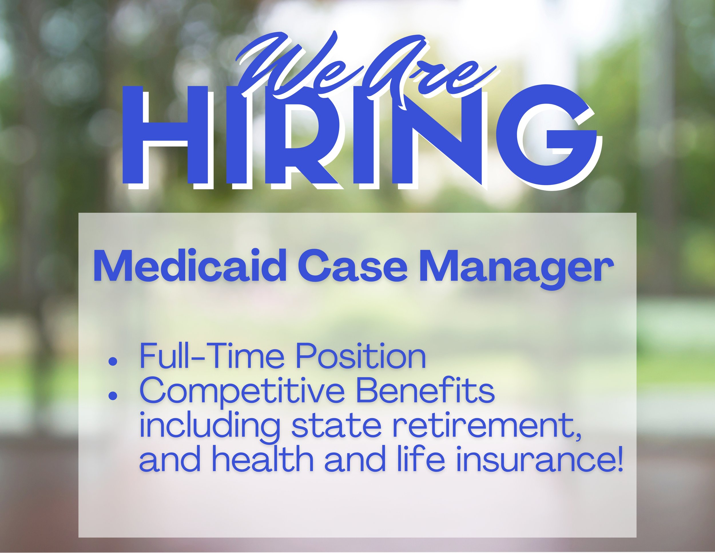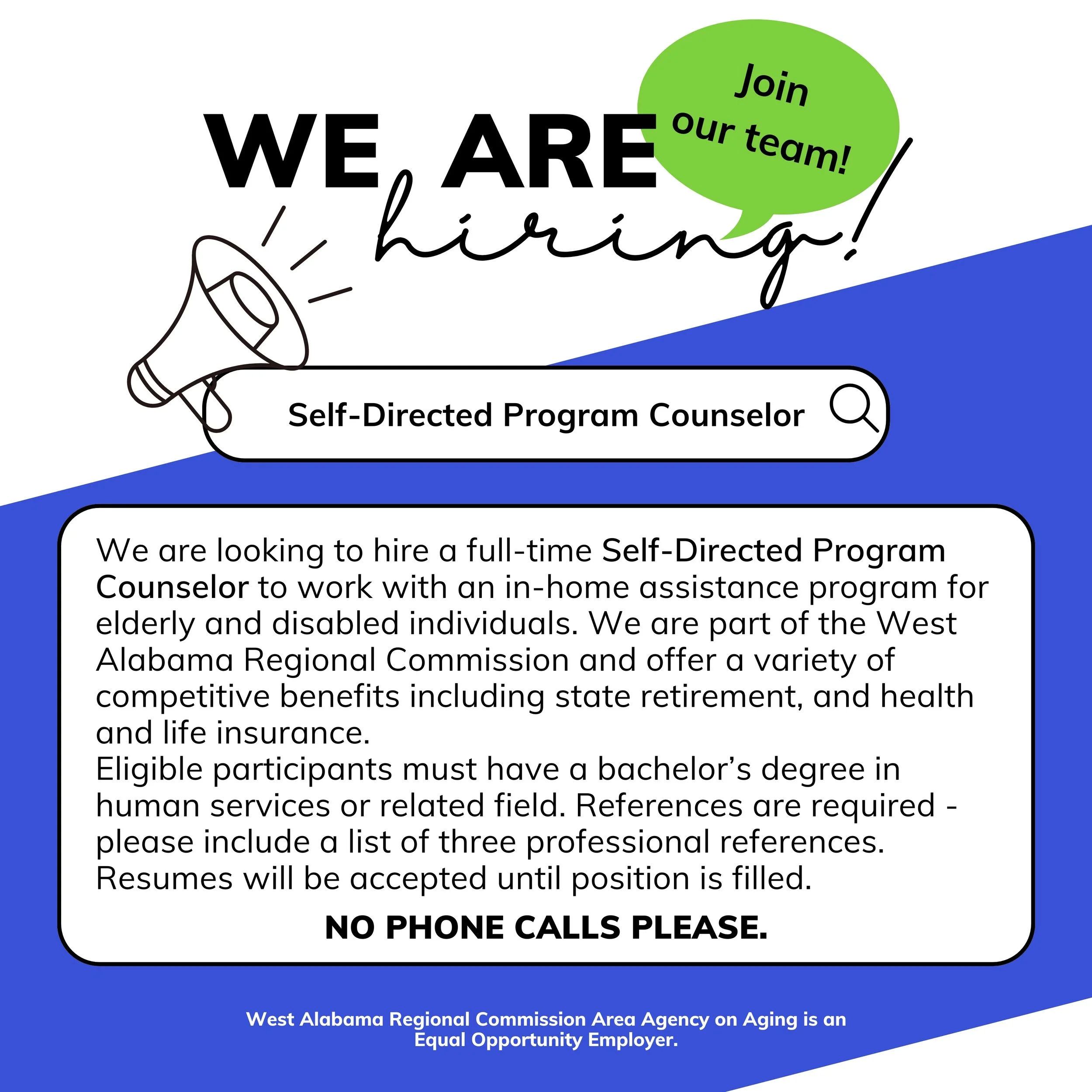 We are looking to hire a full-time Case Manager to work with our Medicaid Waiver HCBS program. The program serves elderly and disabled individuals that are at risk of institutionalization by providing in-home support services. We are part of the West Alabama Regional Commission and offer a variety of competitive benefits including state retirement, and health and life insurance.